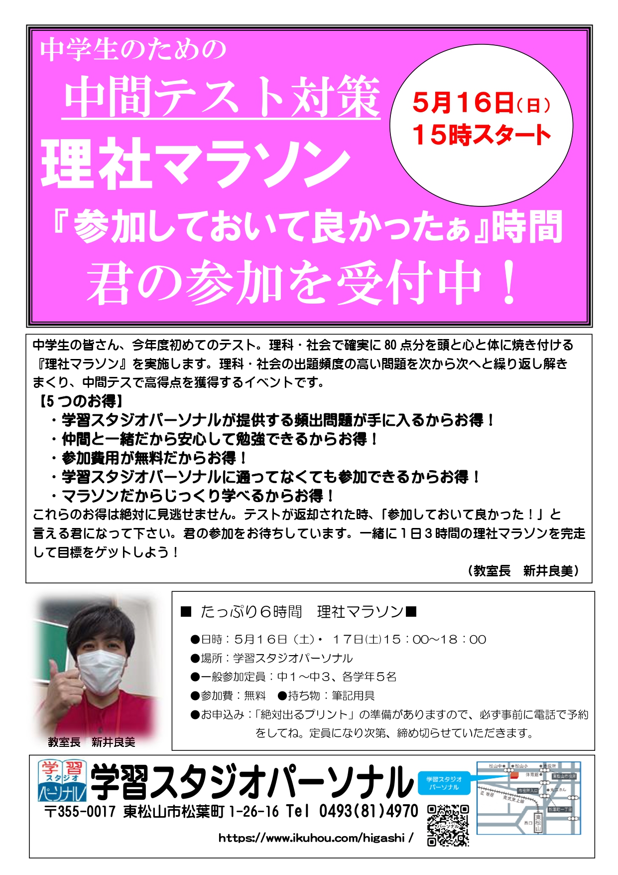 2026/04/09 🎏1学期中間試験対策「理社マラソン」🎏 🌸ご入学・ご進学おめでとうございます🌸 新しい出会いを大切にし素敵な思い出をつくってくださいね そんな仲間達と一緒に中間試験の対策をしませんか! お待ちしております☺ ☛詳細はこちら☚ 一覧へ