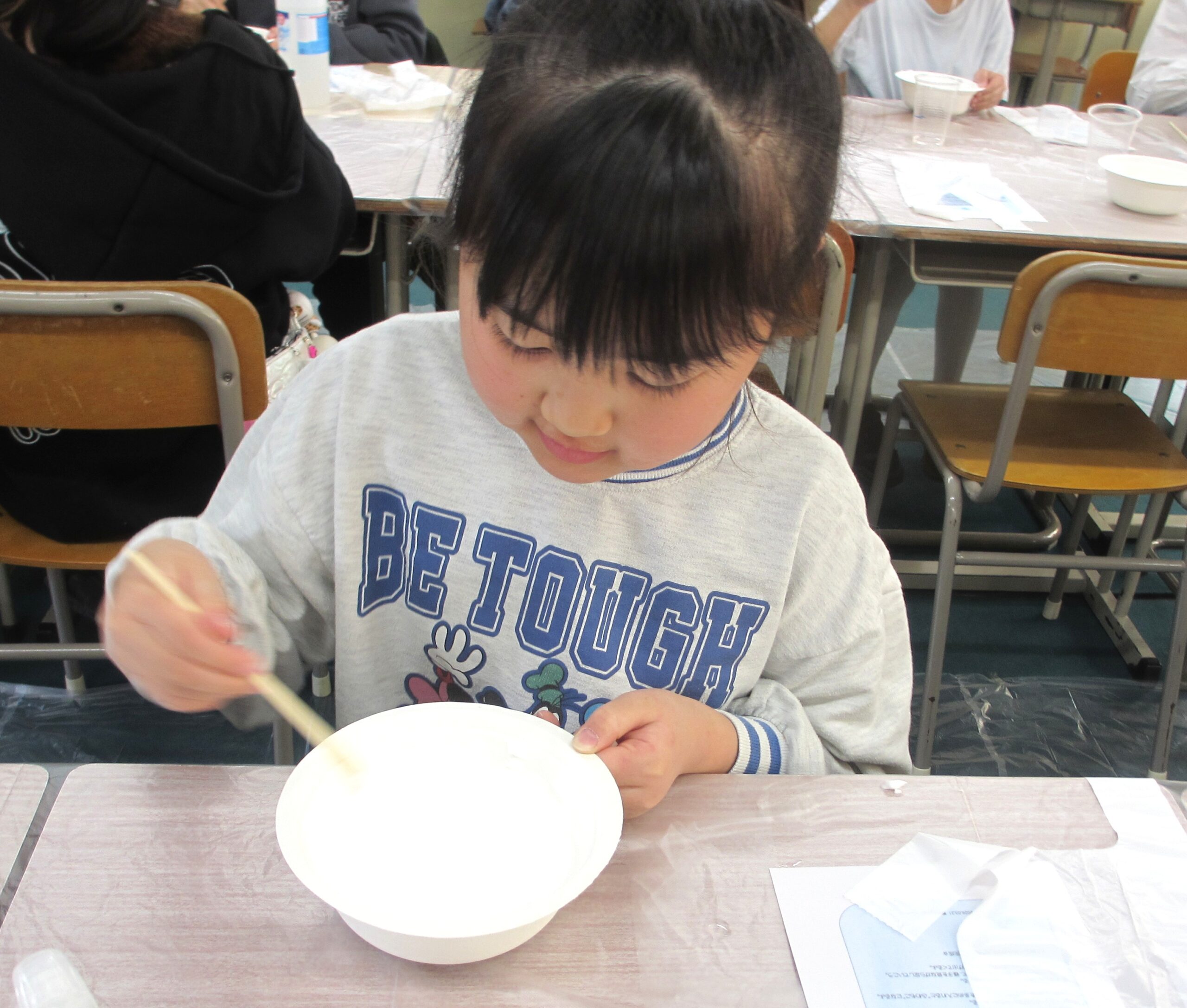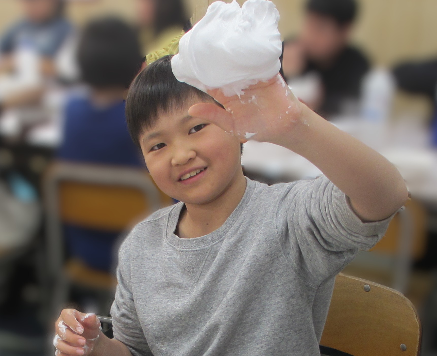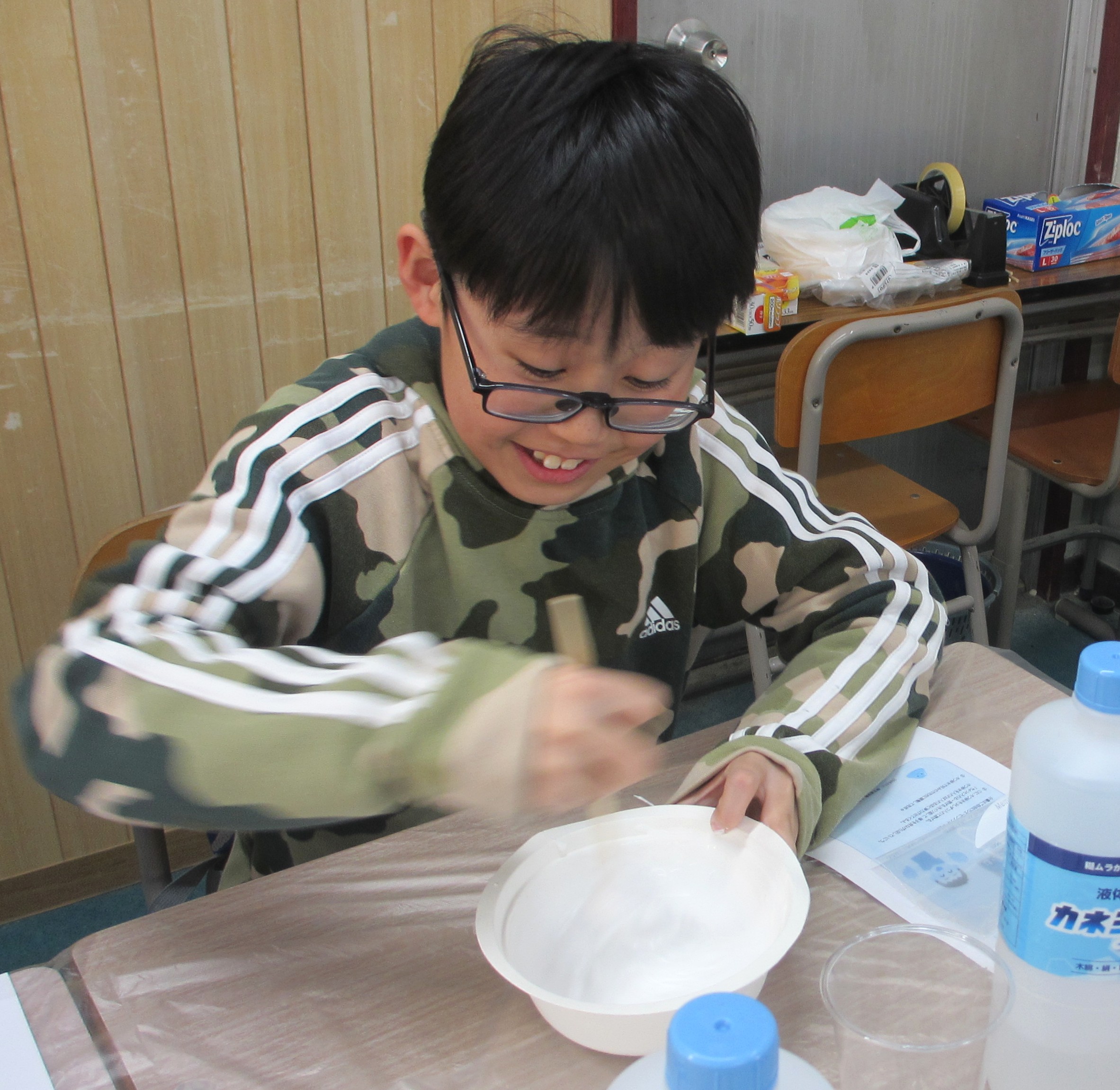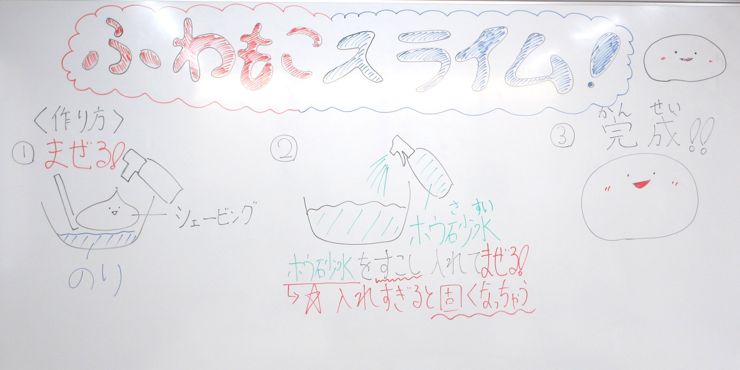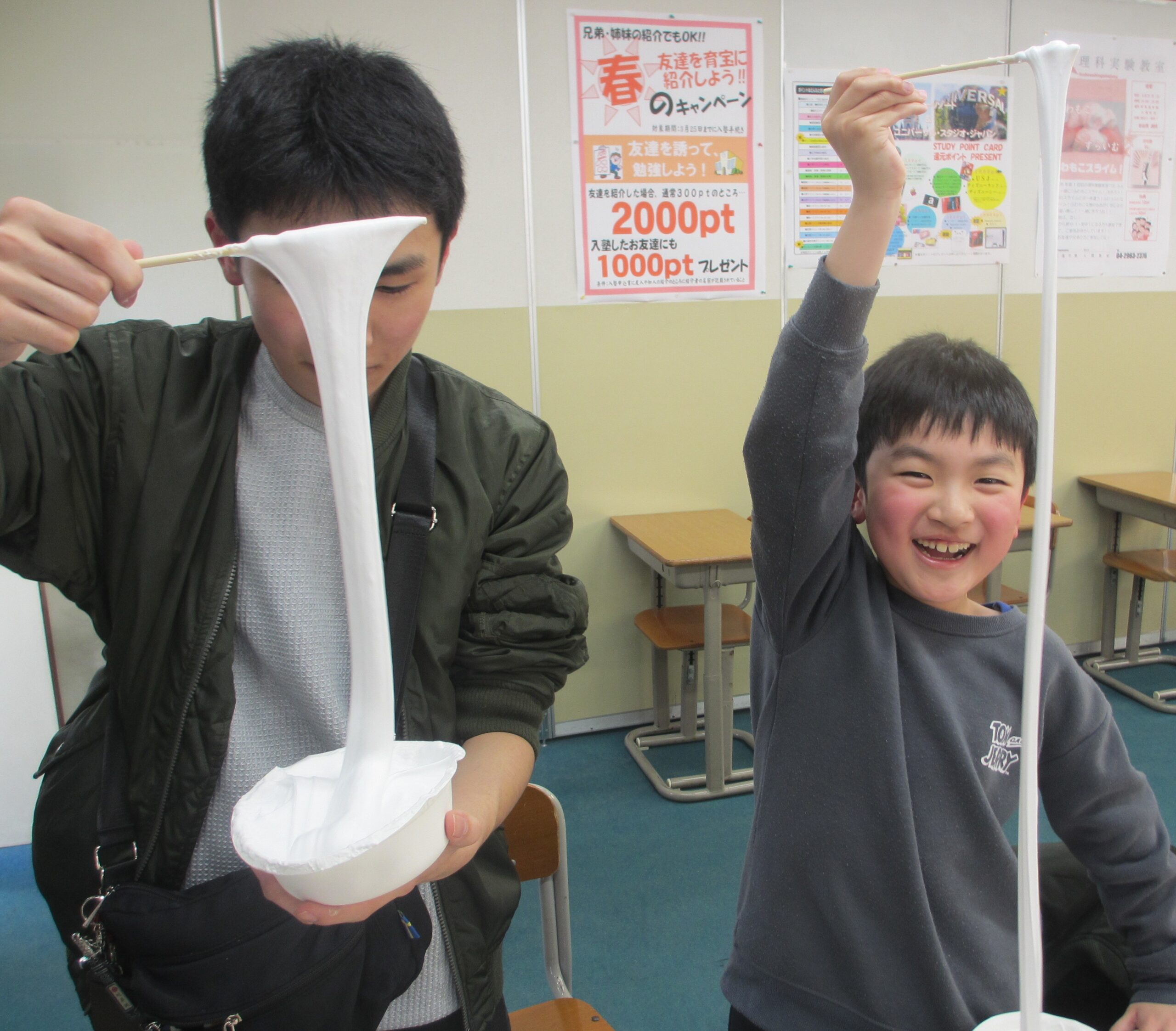 2026/03/21 理科実験教室「ふわもこスライム!」 育宝進学塾 入間教室 3/21土ふわもこスライムを皆で作りました!! 洗濯のりをボウルに入れて、シェービングフォームを入れてまぜまぜ! 上手にまぜてるね! まぜたらホウ砂水をきりふきで入れてまぜまぜ! ホウ砂水は入れすぎるとスライムが固くなっちゃうから要注意!! すごい!!のびるのびーーーる!! ふわもこスライムの完成!!!!!!! みんな楽しんでくれて良かったです!! 次回も面白い企画を行うので、参加お待ちしております!!!! 一覧へ