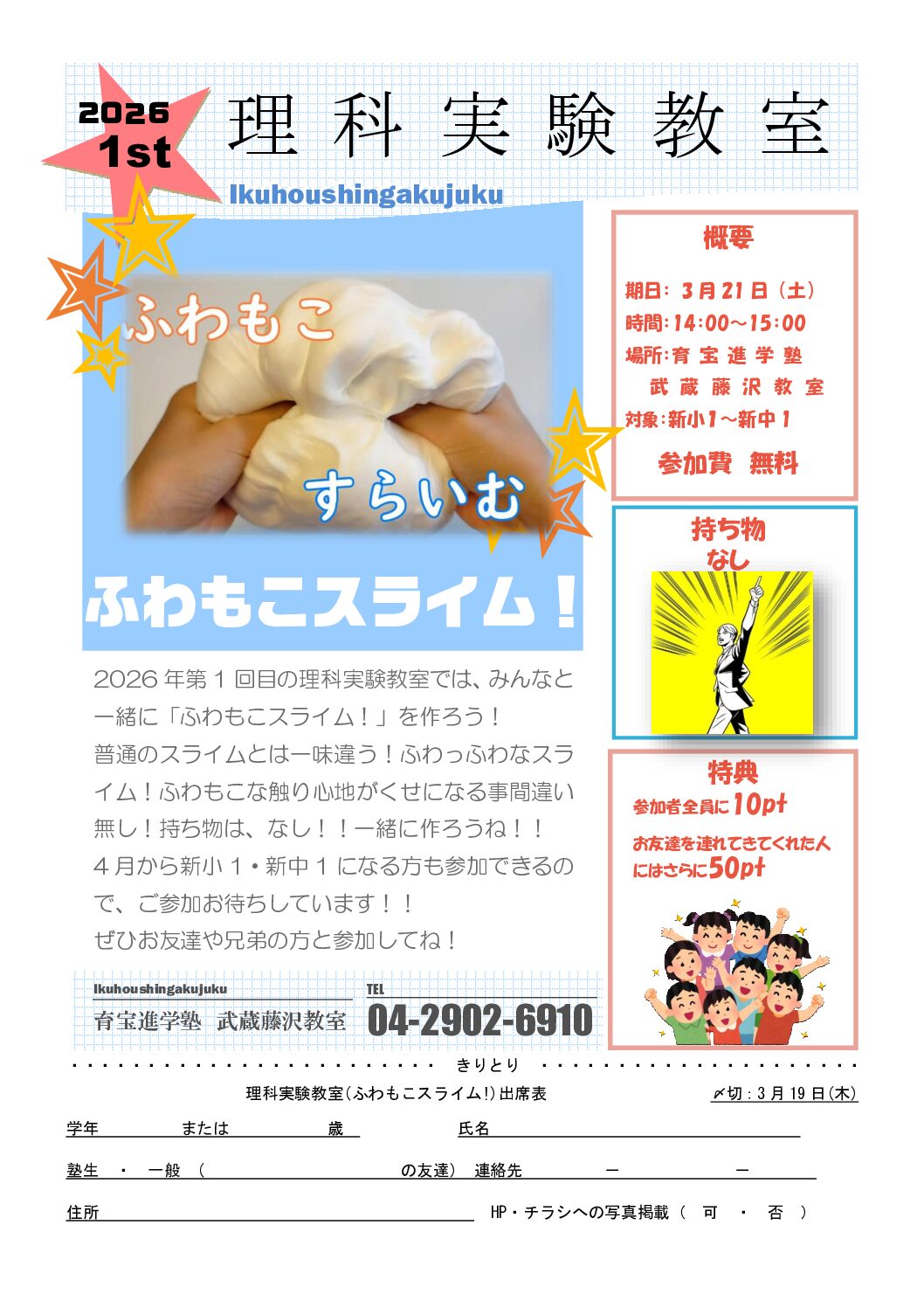 参加無料!!小学生・新中1対象ー理科実験教室「ふわもこスライム」