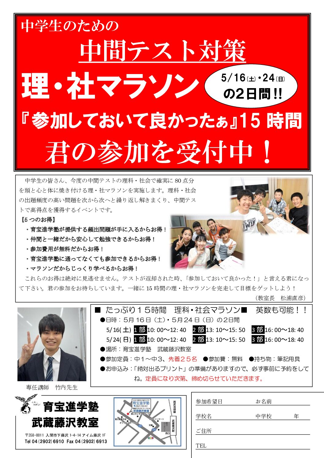中学生対象!! 無料中間テスト対策「理社マラソン」開催!!5/16(土)5/24(日) 飯能市・入間市・小川町の【育宝進学塾】