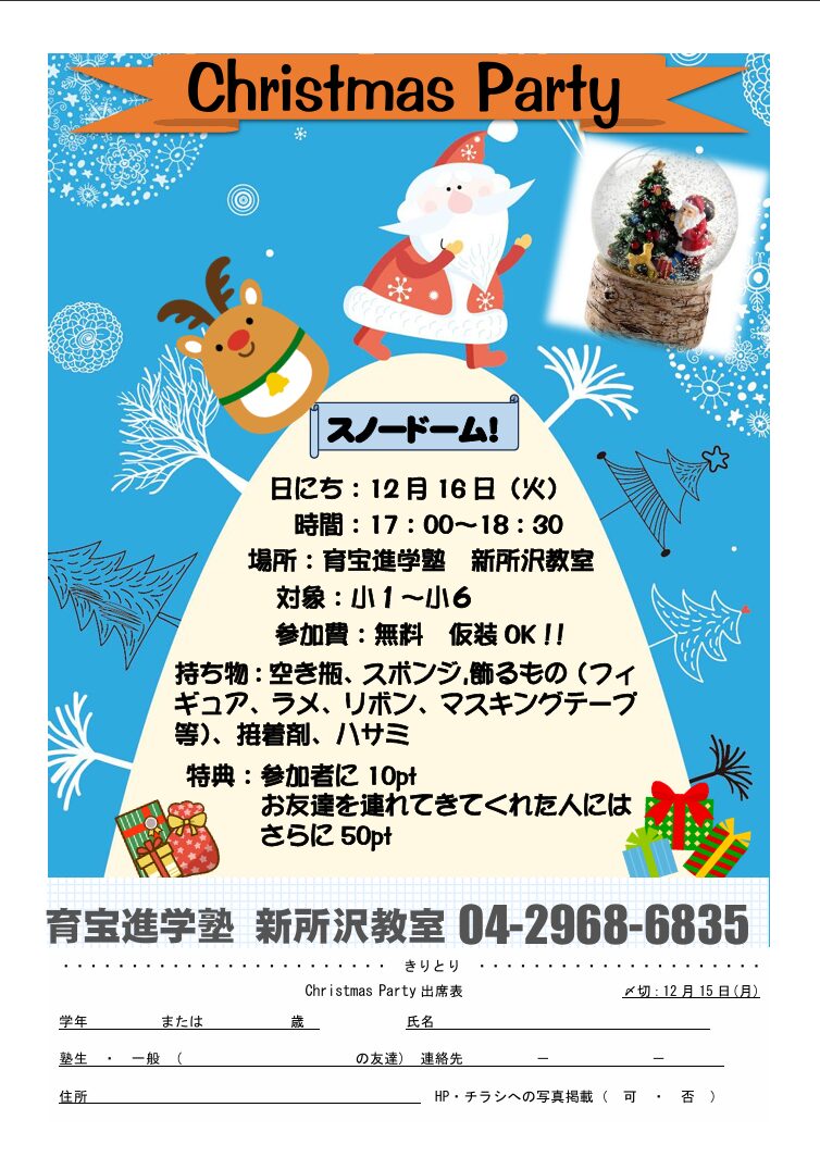 2025/10/15 小学生イベント「クリスマスパーティー!」12月16日(火) 小学生イベント「クリスマスパーティー!」 日時:12月16日(火)17:00~18:30 今回の小学生イベントはなんと!クリスマスパーティーを開催します!! スノードームを作ります!!! 空き瓶、スポンジ、飾るもの(フィギュア、ラメ、リボン、マスキングテープ等)、ハサミ、接着剤を持って来てね!! ぜひお友達と一緒に参加して、楽しい思い出を作りましょう!! ちなみに仮装OKです! お電話の方はこちら 04-2968-6835 一覧へ